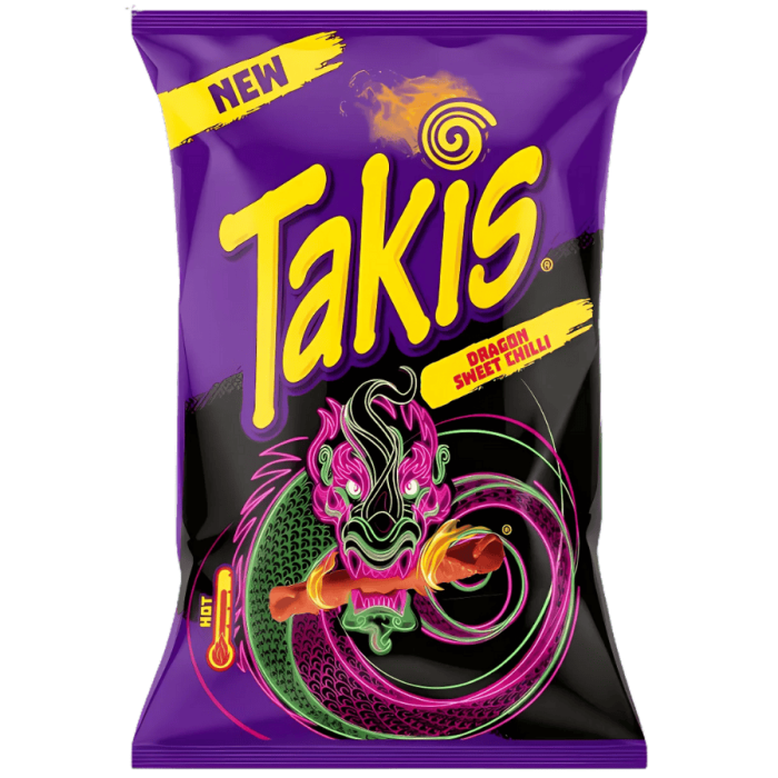 Takis, som ingår i Barcel‑familjen, specialiserar sig på kryddade och karaktärsstarka rullade tortillachips. Med premiumformat och genomarbetade smaksammansättningar riktar de sig till konsumenter som söker extrema smak- och texturupplevelser. Dragon‑serien representerar en mer sofistikerad smakbalans: sötma mot hetta.