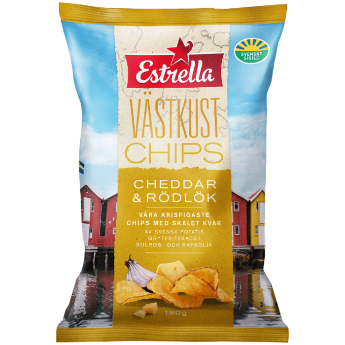 Estrella har i över 60 år varit ett av Sveriges mest uppskattade varumärken inom snacks. Deras Västkustchips-serie tillverkas på svensk potatis och friteras långsamt i små satser för en rustik, extra krispig textur. Smaken Äkta Cheddar & Rödlök är en modern klassiker – skapad för dig som vill ha chips med djup, karaktär och genuin kvalitet.