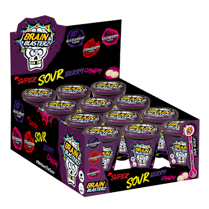 Brain Blasterz Berry Tub är ett intensivt surt bärgodis som lever upp till sitt namn – en explosion av smak för dig som älskar extremt surt. Med 12 praktiska bägare per display är detta ett perfekt storpack för återförsäljare, event eller dig som vill maxa godisupplevelsen hemma. Innehåller smaker som svartvinbär, hallon och jordgubb – alla med Brain Blasterz signatur: super sour.